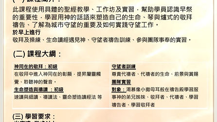 (一) 課程簡介: 此課程使用具體的聖經教學、工作坊及實習,幫助學員認識早祭的重要性,學習用神的話語來塑造自己的生命、琴與爐式的敬拜禱告、了解為城市守望的重要及如何實踐守望工作。